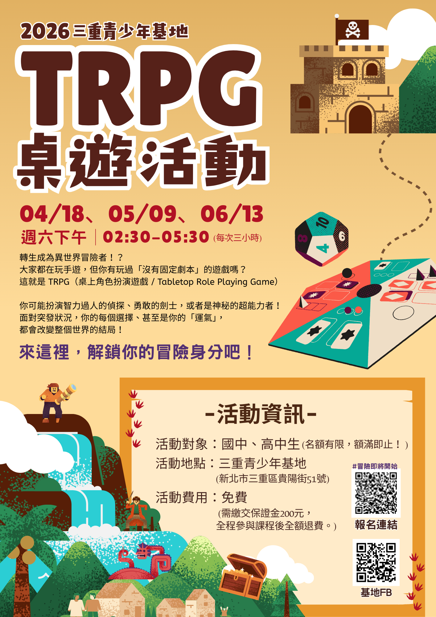 三重青少年基地【TRPG桌上角色扮演遊戲】,活動完全免費,可選擇單場報名,轉知國、高中學生。